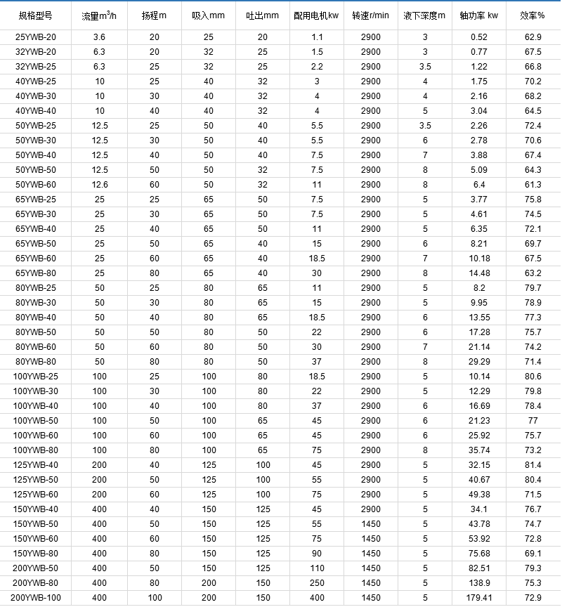 YWB液下無軸泵,適用于在-85℃~350℃條件下,長期輸送任意介質(zhì)酸、氧化劑及腐蝕性介質(zhì),廣泛應(yīng)用于化工、石油、制 藥、農(nóng)藥、電子、電力、電鍍、冶金、消防、環(huán)保、國防軍工、稀土冶煉等行業(yè)。其液下深度最深可達(dá)8米,使用時間是一般長軸液下泵的數(shù)十倍,使用安裝十分方便,克服了原單級單吸液下泵在運輸安裝運行過程中泵軸易彎曲變形(泵軸長度等于液下深度),軸承易損壞、軸套難以維修等缺點。 YWB液下無軸泵是根據(jù)廣大化工行業(yè)用戶的要求設(shè)計的新型產(chǎn)品,該泵采用外混式自吸結(jié)構(gòu),除首次啟動前須向泵體內(nèi)注滿泵體溶液,以后的頻繁啟動不需灌注引水或抽排真空,操作方便,安全省事。機械密封由英國格蘭盤根公司與國內(nèi)聯(lián)合制造,結(jié)構(gòu)合理,性能可靠,維修方便,節(jié)約能源,是建設(shè)文明工廠的理想設(shè)備,有效地解決了長軸易彎曲和泄漏問題。? YWB液下無軸泵系列產(chǎn)品的生產(chǎn)、制造及驗收規(guī)范,嚴(yán)格執(zhí)行了有關(guān)標(biāo)準(zhǔn)規(guī)定并臺臺檢測,備案待查,以保證系列產(chǎn)品的質(zhì)量。該產(chǎn)品分別采用F46、UHMWPE超高聚乙浠、1Cr18Ni9Ti、1Cr18Ni12Mo2Ti、0Cr18Ni12Mo2Ti、日本標(biāo)準(zhǔn)SUS321、日本標(biāo)準(zhǔn)SUS304、日本標(biāo)準(zhǔn)SUS304L、美國標(biāo)準(zhǔn)316、美國標(biāo)準(zhǔn)316L、CD4MCu、K合金、Monel合金、哈氏B合金、Ti合金及各種鑄鋼、鑄鐵、銅、鋁等材質(zhì)。全系列共5個型號,10個規(guī)格,揚程:10~25m,流量:3.6~400m3/h。